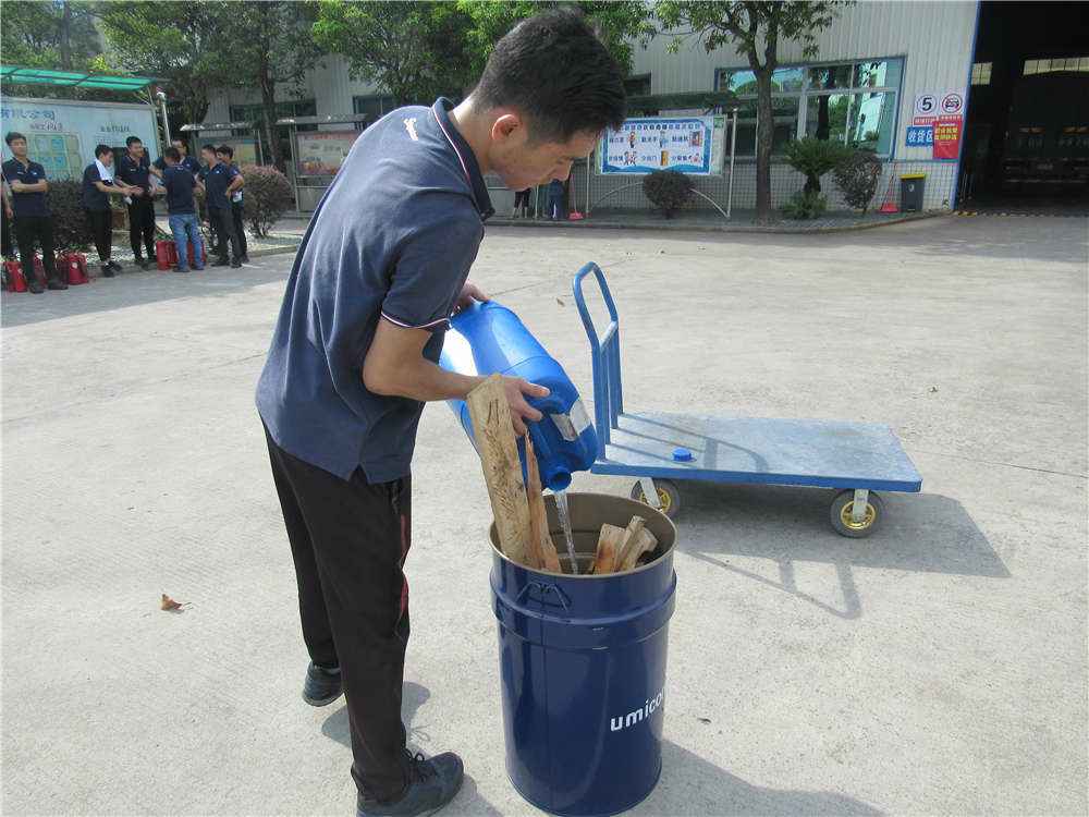 灭火器和消防栓火灾扑救演练;15:45在唐主任的带领下,在厂门口空旷地带,准备灭火演练材料及灭火器、消防栓等。